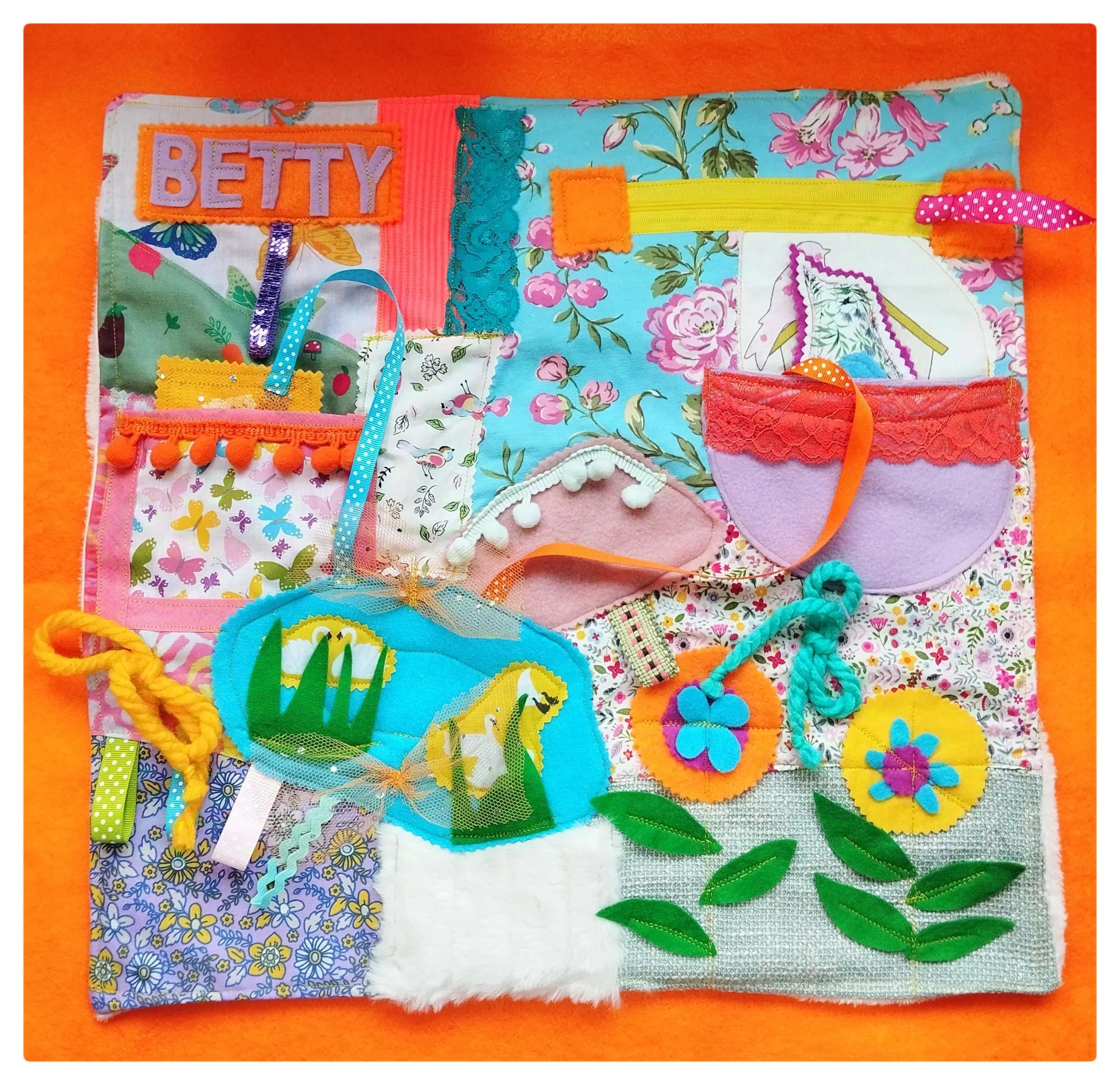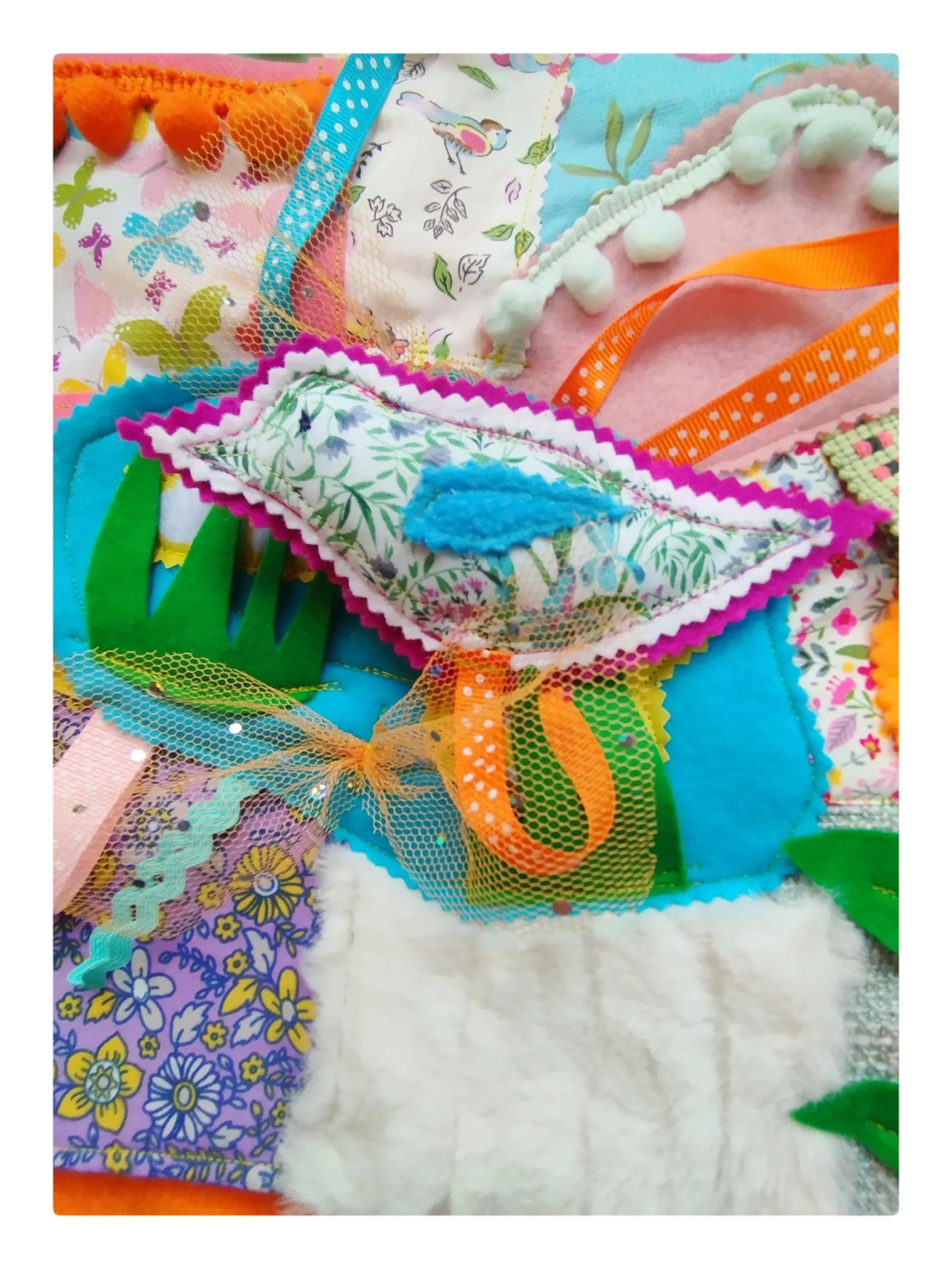 - Sensory Attachments: Includes a rich variety of tactile features such as textured fabrics, colourful ribbons, securely stitched buttons, zips for repetitive motion, sequins for sparkle, fringing for texture, crackle fabric for auditory feedback, and a keychain clip for attaching personal items. These elements are designed to stimulate touch, sight, and sound in a gentle, non-overwhelming way.